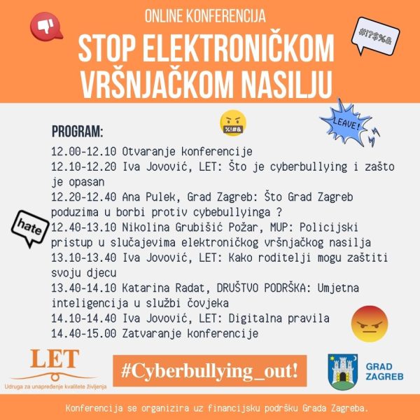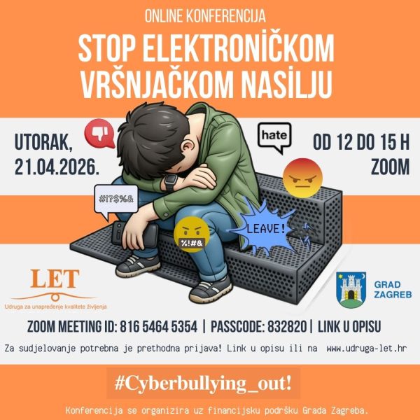Udruga LET organizira online konferenciju pod nazivom „STOP vršnjačkom elektroničkom nasilju“, koja će se održati 21. travnja 2026. godine od 12 do 15 sati putem platforme Zoom.