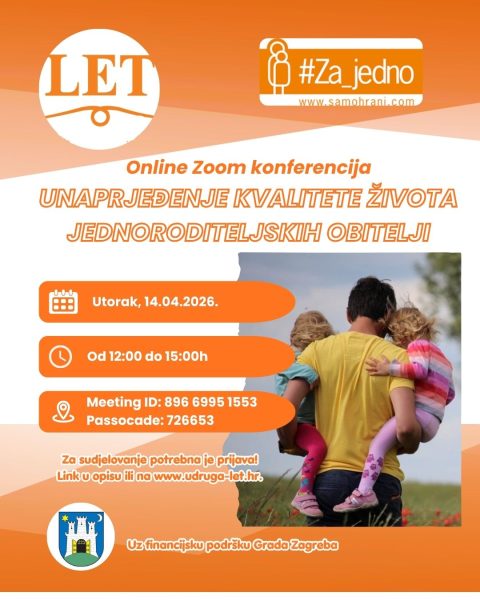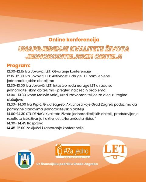 Tijekom konferencije bit će predstavljene aktivnosti Udruge LET, Grada Zagreba, Ureda Pravobraniteljice za djecu i STUDENCA usmjerene jednoroditeljskim obiteljima, iskustva izravnog rada s korisnicima, uvidi iz prakse institucija te rezultati istraživanja o kvaliteti života jednoroditeljskih obitelji.